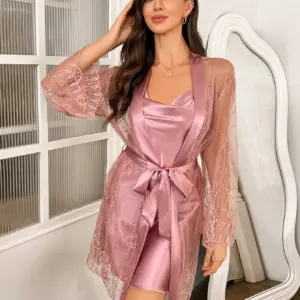 Hot-selling solid-color polyester nightgown lace see-through robe for women 2pcs set