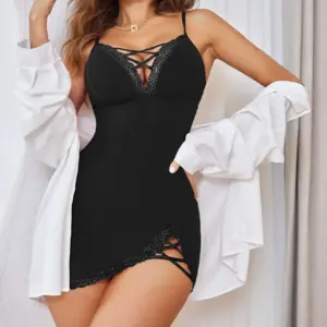 Fashionable and Sexy Backless Slim Fitting Pajamas with V-Neck Hollow out Side Slit Dress for Casual Home Wear