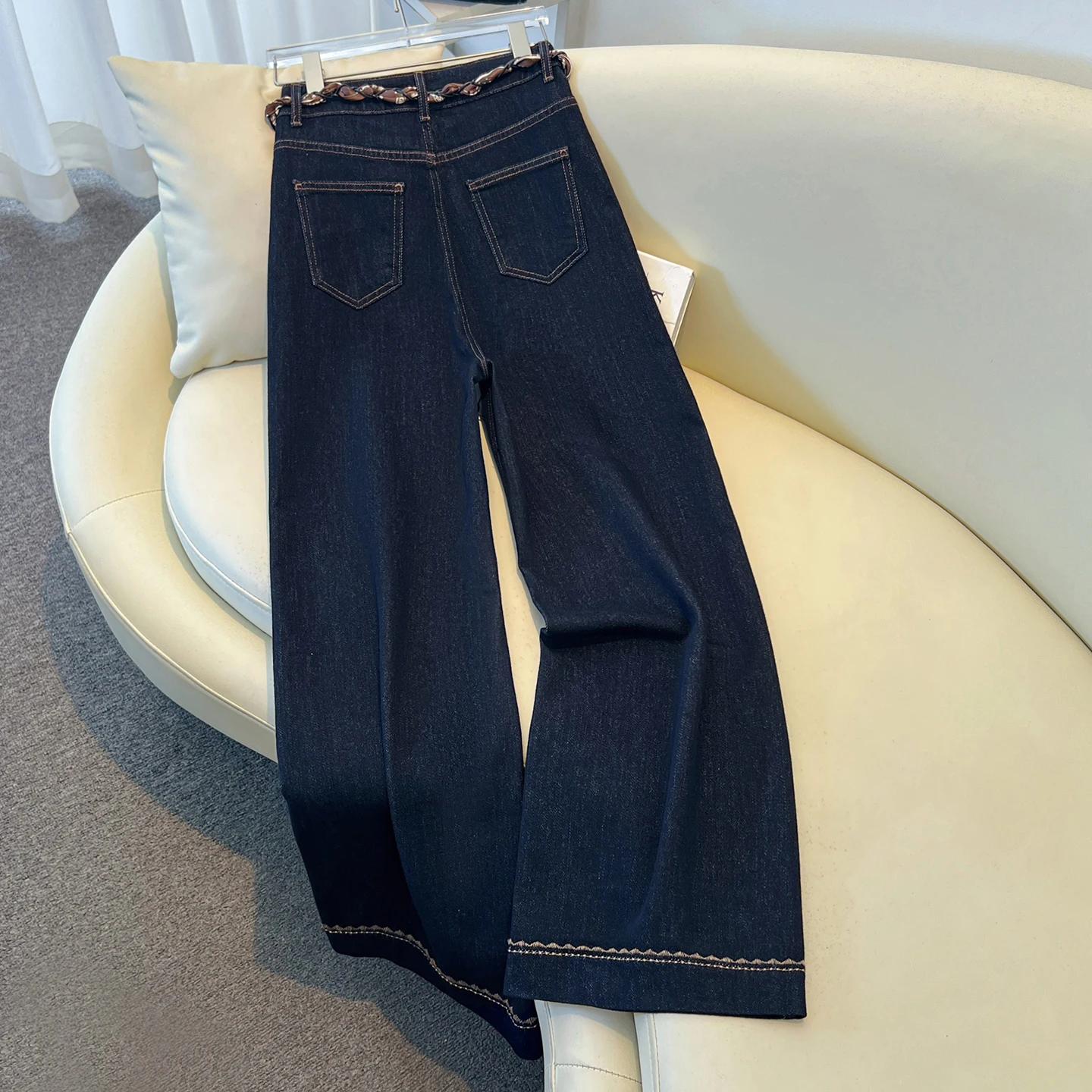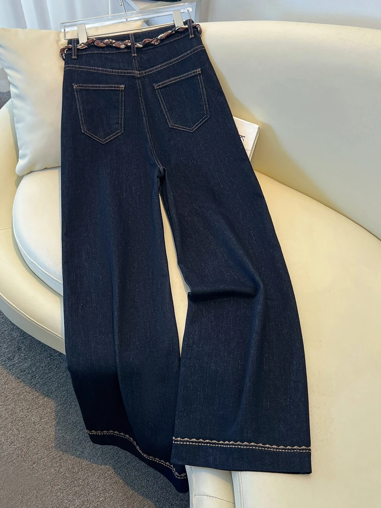 2025 Autumn New Denim Blue Wide Leg Women’s Jeans Super Popular Pants with Silk Scarf Belt Fashion Straight Trousers