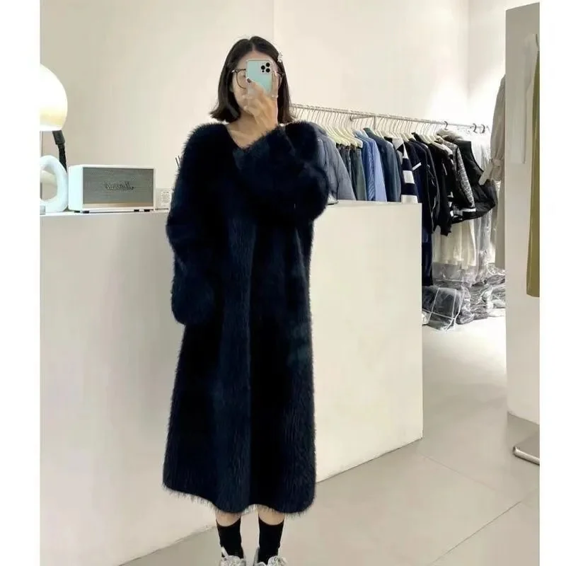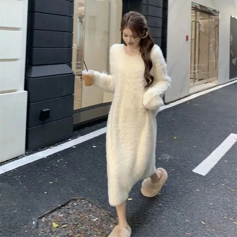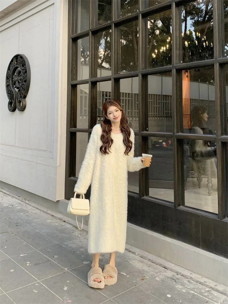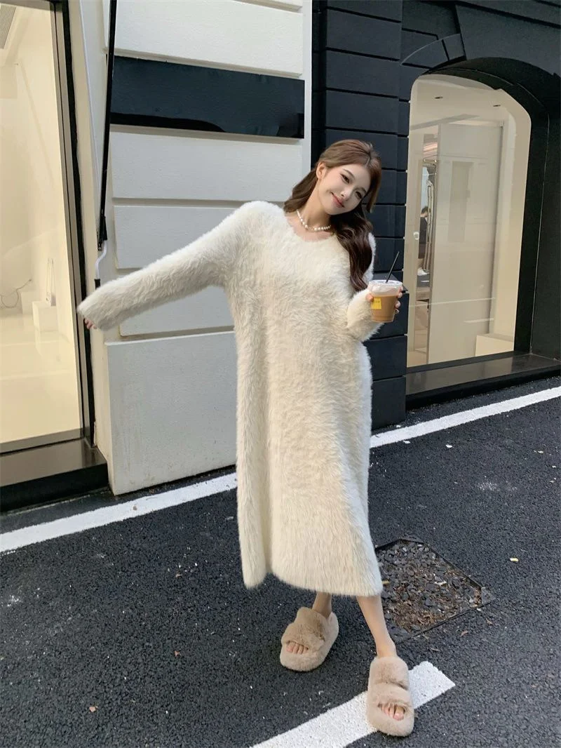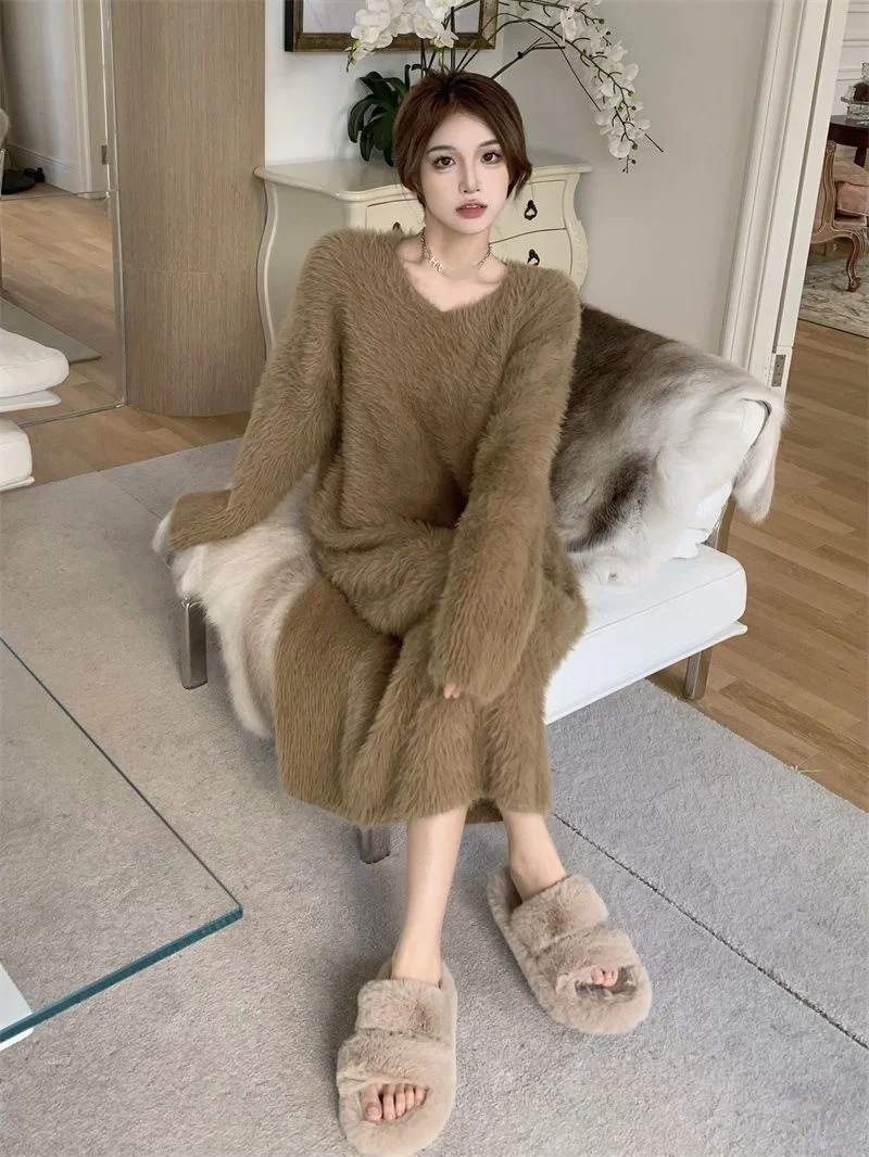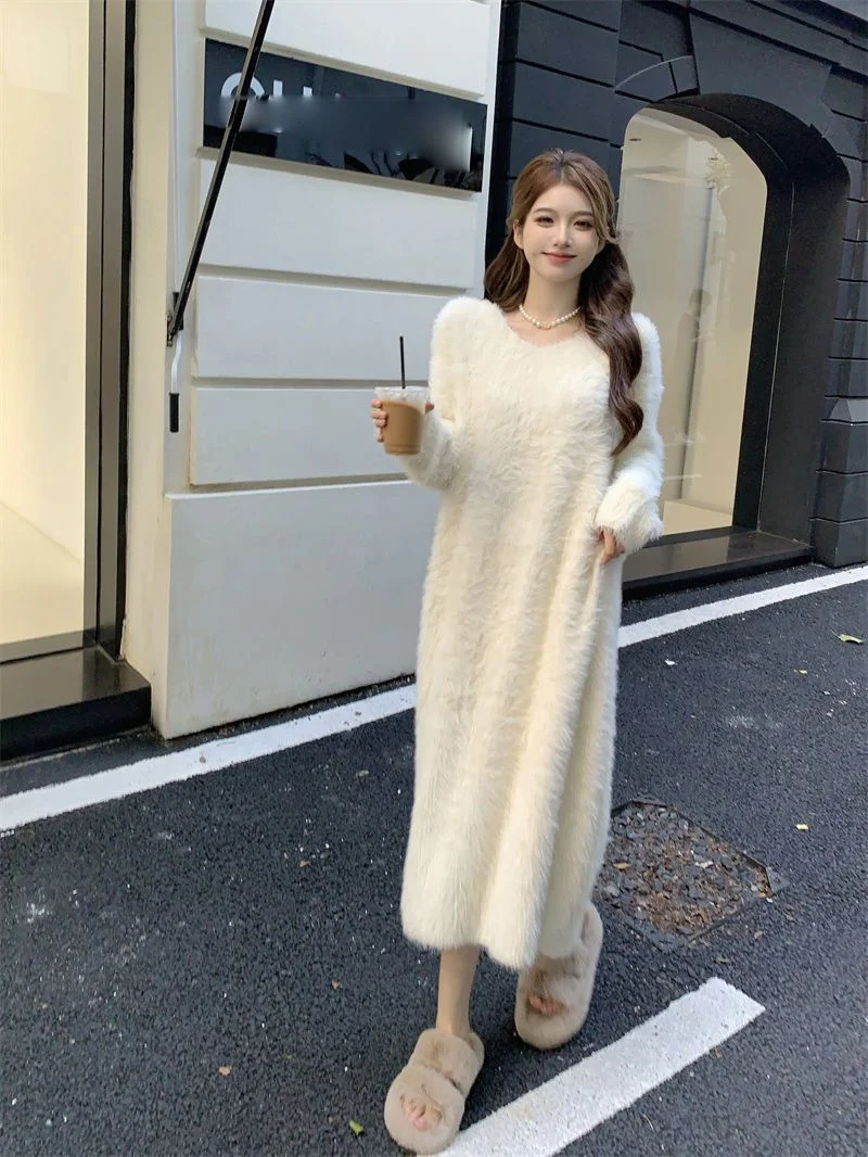 2025 Autumn/Winter Loose Popular Pink Imitation Mink Fleece Loose Knee Length Long Fur Dress Women’s Pajamas Dress Solid Color