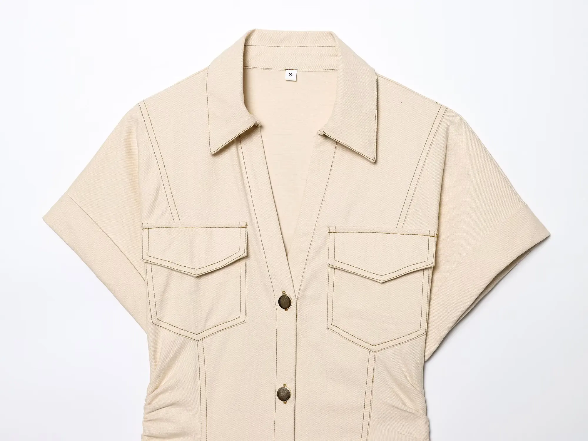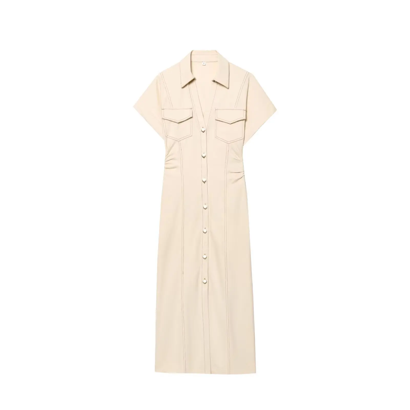ETJ 2025 summer new women’s elegant fashion waist pleated V-neck short-sleeved temperament denim MIDI dress