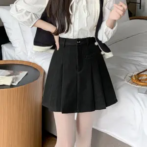 Vintage Winter Pleated Mini Skirt Women Streetwear High Waist Woolen Cute Skater Skirts With Shorts Belt Grey Black Skirt Woman