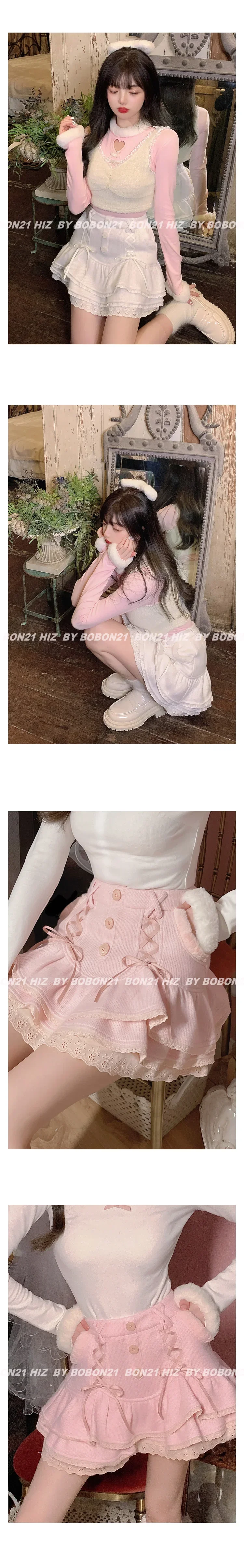 Japanese Kawaii Lolita Mini Skirt Women Winter Lace Casual Elegant Sweet Female Skirt High Waist Bandage Korean Skirt 2024 New