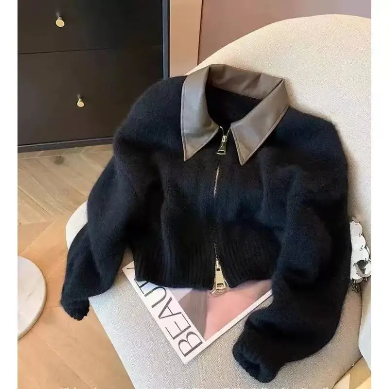 Patchwork Zipper Cropped Cardigan Women 400g Thick Autumn Knitted Sweater Bomber Jacket Vintage 2000s Short Fitted Knitwear Coat