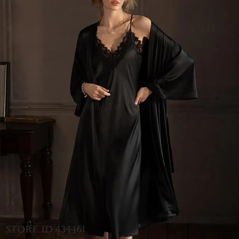 Plus Size Long 2PCS Robe Nightgown Set Pajama Elegant Kimono Bathrobe Gown Sleepwear Summer Sexy Women’s Homewear Loungewear
