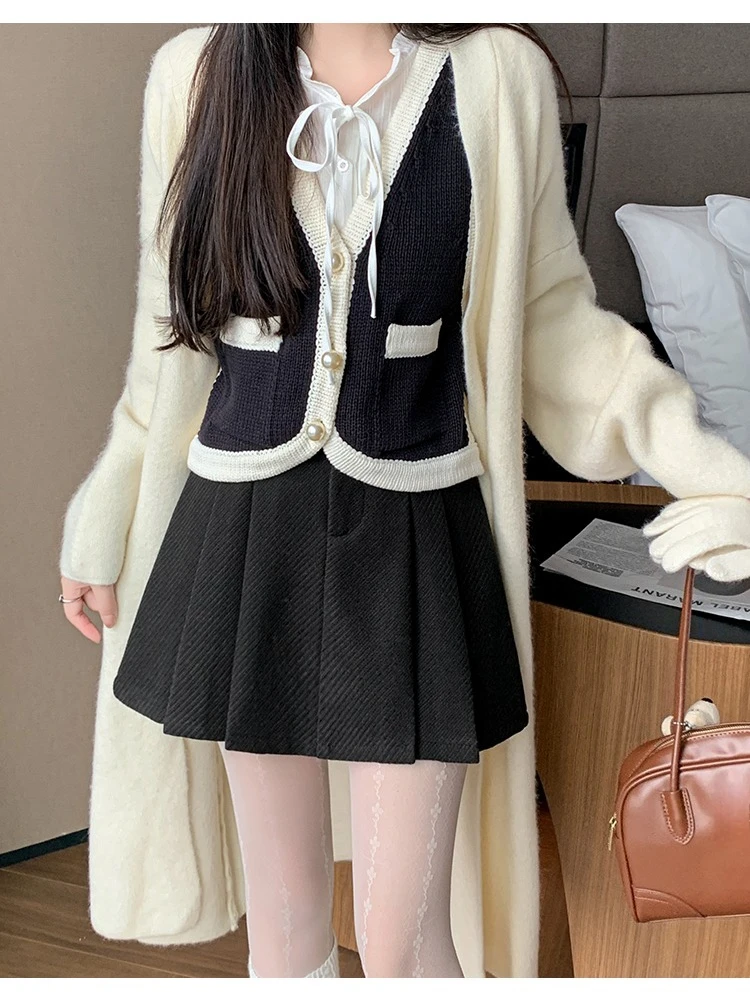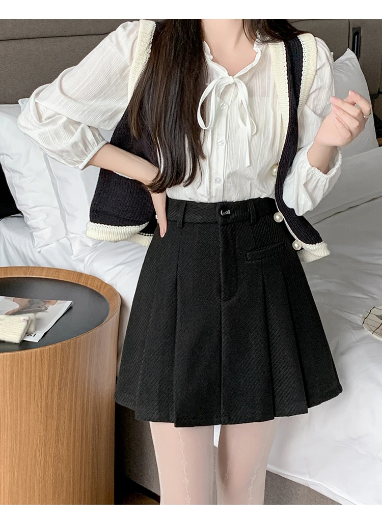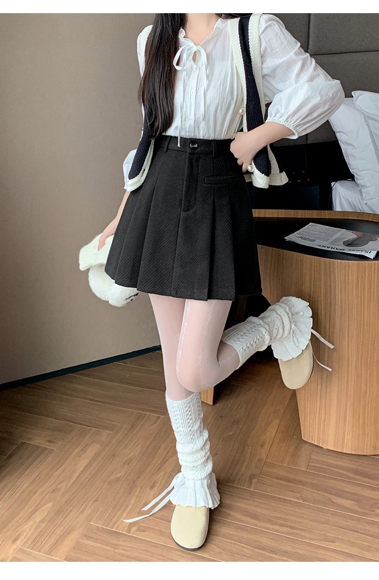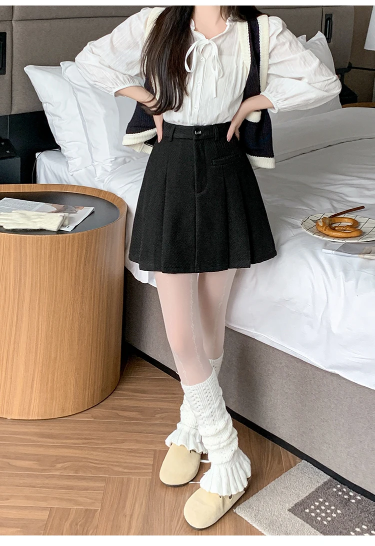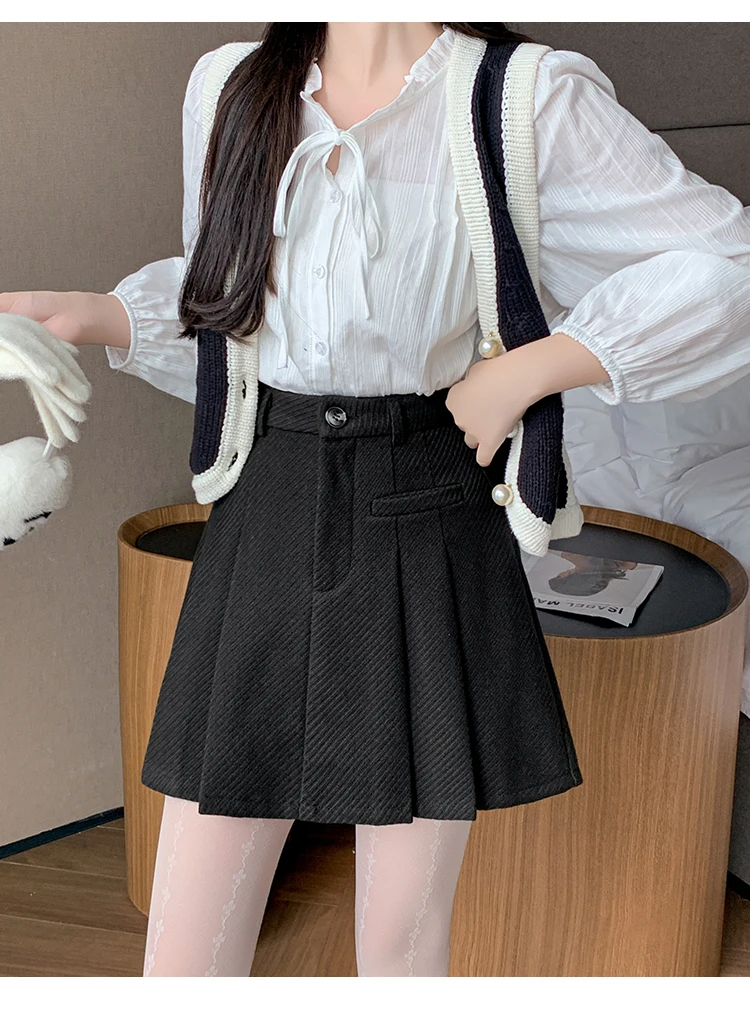 Seoulish High Waist Vintage Woolen Women’s A-line Short Skirts 2025 New Vintage Autumn Winter Pleated Casual Skater Mini Skirts