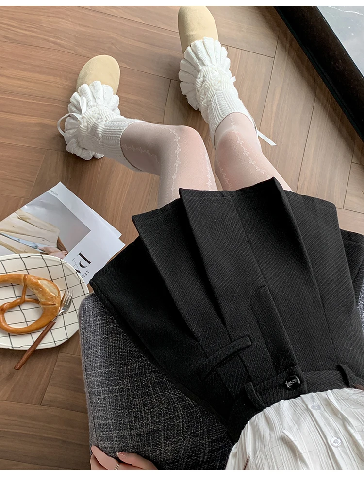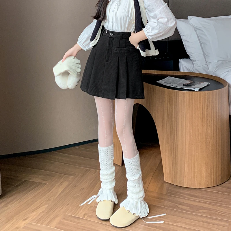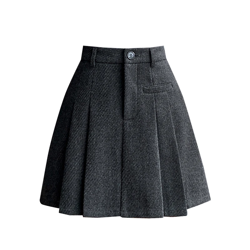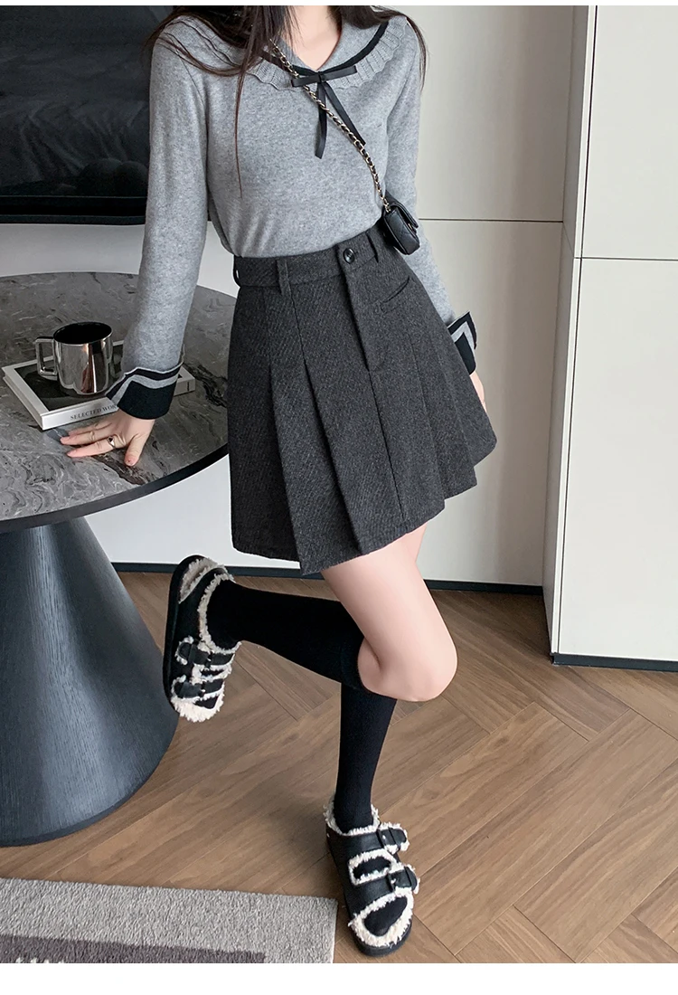 Vintage Winter Pleated Mini Skirt Women Streetwear High Waist Woolen Cute Skater Skirts With Shorts Belt Grey Black Skirt Woman